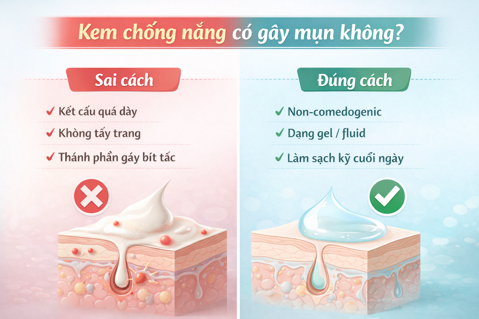 Kem chống nắng tự thân không phải nguyên nhân trực tiếp gây mụn. Tuy nhiên, nếu: